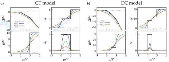 Thermal averages for the CT model (a) and the DC model (b), plotted as a function of for four values of T in units of , where is Boltzmann’s constant (see legend in the top left panel). (Top left): Grand potential. (Top right): Total number of occupied sites. (Bottom left): Total energy. (Bottom right): Order parameter (see text).
