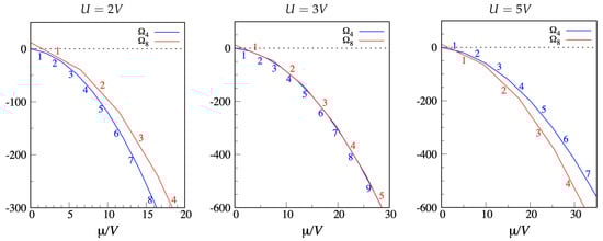 CT model with multiple occupancy allowed. The grand potential (in V units) is plotted as a function of for two families of “cluster crystals”, (blue) and (red), and for three values of . Red and blue numbers are values of n.