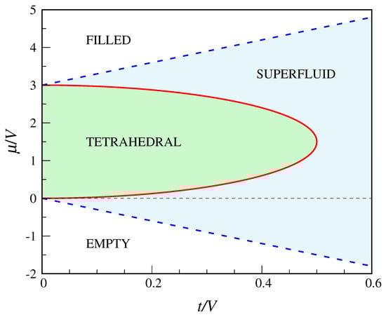 which respectively separate the cubic and co-cubic regions from the superfluid region, the total number of particles jumps discontinuously. Only at the lobe vertices and the two “crystal”—superfluid transitions are continuous. The line separating the two “crystalline” regions ends at the point where the two boundary curves (37) cross each other. However, this triple point is only metastable since, in the whole region bounded by the blue circuit of Figure 5, the stable phase is actually supersolid.
