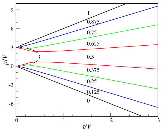 Let us again reconsider the QCT model at . Due to the relatively small dimensionality of its Hilbert space (=256), the model can be solved numerically, determining (among others) the exact ground state and its eigenvalue (i.e., the grand potential) as a function of t and . This is obtained by representing the grand Hamiltonian H on the Fock basis (with or 1 for all i) and diagonalizing the ensuing matrix. An extensive mapping of a few quantum averages enables us to clarify the nature of the “phases” present.