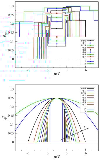 Another difference with MF theory concerns the ground-state averages of and : these are identically zero for all t and values, which may seem in stark contrast to the behavior of the MF parameter . In fact, it is not these averages that should be monitored in an exact treatment but rather the quantity defined at Equation (38). In the top panel of Figure 7, I have reported the values computed along a few iso-t lines; each jump discontinuity of occurs in coincidence with one of the site occupancy. For comparison, in the bottom panel of Figure 7, I show the MF values of along the same lines. We see a clear correlation between the two behaviors, which demonstrates the existence of signatures of superfluidity in a finite quantum system. However, intriguing differences also exist: (i) first observe that in the filled mesh, which is an oddity for a perfectly insulating state. In fact, 0.125 is for , suggesting that this is an artifact of the finite system size. (ii) Another finite-size effect is the non-zero values of in the purported tetrahedral region. However, is here sufficiently small so that its peaks in the gaps between the tetrahedral and insulator regions remain well visible—in MF theory these gaps fall in the superfluid region.