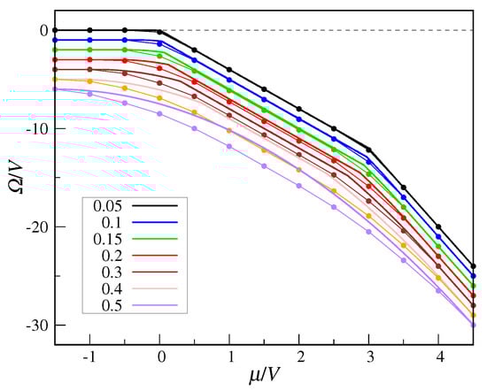 Finally, in Figure 8, I plot the QCT grand potential as a function of for a number of t values in the range 0 to 0.5. In the MF curves, cusp singularities are associated with the crossing of first-order transition lines. We see that MF theory systematically overestimates exact values, the more so the larger t is.