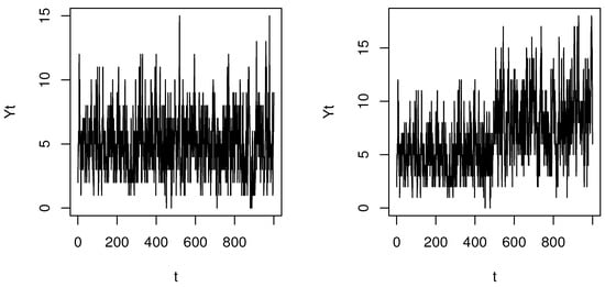 Plots of the Poisson INGARCH(1,1) time series (Case 3) with , and for the left panel and for the right panel.