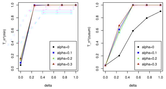 Meanwhile, Table 9, Table 10, Table 11 and Table 12 show that the outliers undermine the performance of the MLE-based monitoring processes in terms of both size and power; namely, size distortions are notable and the power decreases to a certain extent. This result particularly indicates that is improved when the MDPDE with is used, which demonstrates the efficacy of the MDPDE in the monitoring process. By contrast, the size of significantly increases when , indicating that is unstable; see Figure 2. Although not reported here, we also examined the performance of the same monitoring processes for NB INGARCH(1,1) models. The result for this case showed a similar pattern to the Poisson INGARCH(1,1) case. All our findings strongly affirm that is the most favorable among the monitoring methods considered in this study.