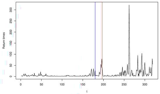 In this section, we apply to a real dataset, using the extreme events of the daily log-returns of GS stock from 2 July 2007 to 28 February 2020. Davis and Liu [11] and Kim and Lee [37] used the GS stock datasets with different periods, but their works were focused on parameter estimation and the retrospective change point test. For the task of online monitoring, we first calculated the hitting times, for which the log-returns of GS stock fall outside the 0.05 and 0.95 quantiles of the data, and generated the time series of counts , . Figure 3 plots and exhibits the presence of a number of outliers. Fitting the Poisson INGARCH(1,1) model to the whole observations, we have the MLE of and the MDPDE of = when is used. The significant difference between the two estimates is seemingly due to the presence of outliers. Using as a training sample and viewing , as sequentially observed testing data, we implement the monitoring process with to detect a parameter change. Subsequently, an anomaly is detected when for (blue vertical line) and for (red vertical line), which indicates that the monitoring process based on the MLE is more sensitive to relatively smaller outliers lying around , while that based on MDPDE is more robust to those outliers and detects a more significant change around , ignoring smaller ones. Obviously, we can see from Figure 3 that has a pattern with more fluctuations after . Our finding affirms the adequacy of the MDPDE-based monitoring process in the presence of outliers.