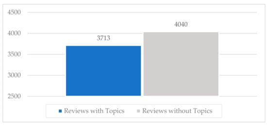 Number of reviews with topics and number of reviews without topics, respectively, derived from the total number of 7753 reviews. As can be seen, there are 4040 reviews without topics and 3713 with topics respectively.