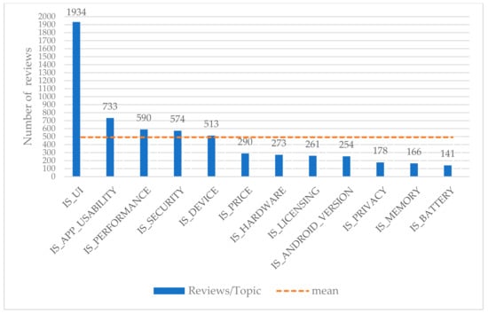 Number of reviews per topic. The whole examined dataset consists of 12 different topics and each one of them is related to a specific amount of reviews. Some topics include a higher number of reviews rather than others. User Interface (UI) topic yields the highest number of reviews (1934), App Usability articulates up to 733 reviews, Performance topic up to 590, and so on.