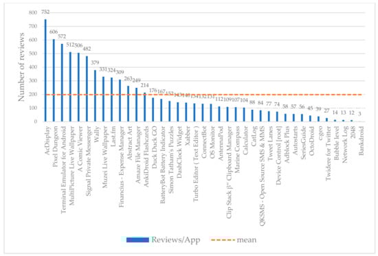 The dataset that was used in our research obtained from GitHub and it was firstly deployed in a prior research effort at the same topic of app reviews utilization [23,24]. The whole dataset consisted of 7753 total reviews with multiple different variables/fields (7754–1 record in the “A Comic Viewer” app, which was completely empty). These include the review’s id, the name of the app, the app version, the text of the review, review’s author, review’s date, ratings from 1 to 5, the pre-classes, and sub-classes that corresponded to the topic of each review. We excluded some variables as they could not give a practical value to the research purpose of the paper. These variables are the review’s id, the app version, the review’s author, and the review’s date. We finally selected and elaborated the variables of the name of the app, the text of the review, the rating of each review, and the sub-classes that each review belongs to. Hereinafter, the subclass’ labels of the dataset are referred to as topics.