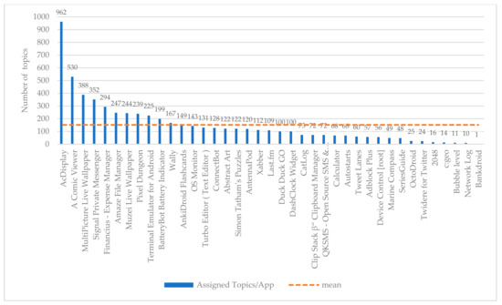Moreover, the reviews correspond to specific applications. In this respect, we depict in Figure 3 the allocation of reviews per app. Lastly, in Figure 4, the number of assigned topics per app are taking place. This is derived as follows: we take into consideration for each app the number of reviews that are related to this one app, and subsequently, for these reviews we have counted all the topics that are related to them.