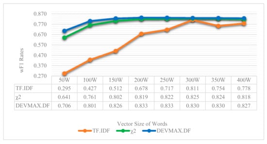 Relying on the visualized results of Figure 6 and Figure 7, it is noted that in a smaller vector size of 50 words, the DEVMAX.DF manages efficiently to detect the best words for terms representation at an earlier phase rather than χ2 and TF.IDF respectively. For example, in Figure 7, χ2 yields a 49.4% wP*wF1 product value, while the DEVMAX.DF a 60.4% respectively. In other words, this highlights a significant improvement in smaller vector size of words of 22% while comparing χ2 and DEVMAX.DF as feature extraction methods. DEVMAX.DF achieves better results, 68.5%, also in 100 words with a percentage of improvement at 6%, while χ2 achieves 64.8%. These results are capable to cover recent research indications of applying the DEVMAX.DF into smaller texts [29].