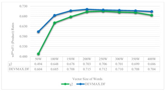 wP*wF1 product rates between the χ2 and the DEVMAX.DF feature extraction methods based on the most efficient classifier, the SMO, through different vector sizes of words.