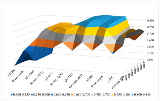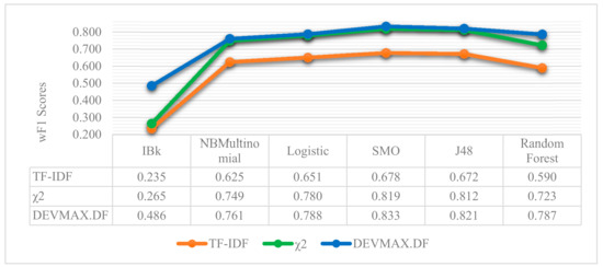 Moreover, in Figure 8 and Figure 9, the performance of machine learning classifiers is presented in the three different feature extraction methods based on the 200-vector size of words. Additionally, in Figure 10, we present the wF1 solution space in terms of the local maxima that are yielded to the best performances, as represented in Table 2, Table 3 and Table 4. It is noted that in all the occasions of applying different ML classifiers, the DEVMAX.DF outperformed both TF.IDF and χ2.