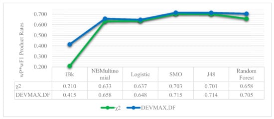 Machine learning classifiers and their wP*wF1 product performance rates between the χ2 and the DEVMAX.DF feature extraction methods based on the specific vector size of 200 W.