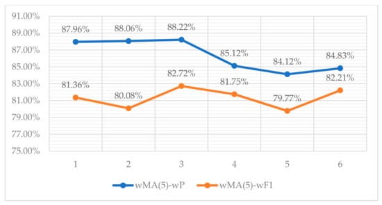 Lastly, in the next figure (Figure 11), we adopt the 5-point moving average, which is weighted by the number of assigned topics per app, hereinafter mentioned as wMA(5). This constitutes an indicator to visualize the performance of the selected classification schema in terms of the wP and the wF1 rates. The wMA(5) calculations are deployed to ensure statistical smoothness of the results among the different selected apps’ performance on topics classification.