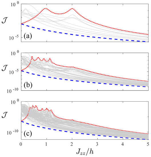 Spin current as a function of the ratio of local field strength and interaction for system sizes (a), (b) and (c). Different lines corresponds to each of the configurations of local fields. We highlight two magnetic field configurations: with the red dotted line we show the current for a field, which is h for the first half of the chain, and for the second half of the chain, which we refer to as , and with the blue dashed line the realization in which the field is in the first half of the chain and h in the second half . Peaks of red dotted line in panel (a) are signalled by black dashed lines that correspond to the black dashed lines in Figure 5. Common parameters are , and .