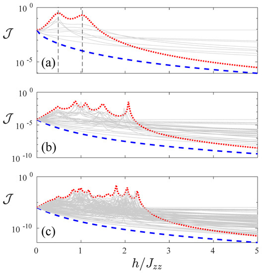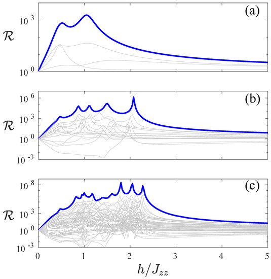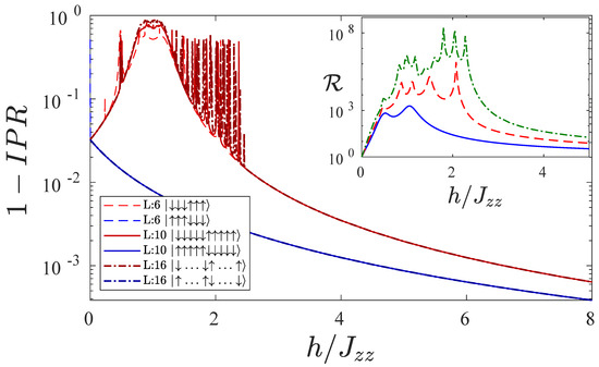 For the state , the physics is very different. For well approximates the highest energetic state, together with . However, while approximates better and better the highest energetic state as h increases, for large enough magnetic field h, the state well approximates the ground state. Hence, this state is bound to go through numerous avoided crossings, at the occurrence of which transport is favored and rectification can be very large. In particular, we observe that, for the state , is close to 1 for , and increases with the system sizes. This is because of the presence of a energy band of state that are crossed for . Beyond this energy band, there can be other avoided crossings which can result in even larger rectification. For instance, in the inset of Figure 6, we illustrate the rectification for different system sizes, showing a significant increase in the rectification power as the system size increases, even up to ( blue continuous line, red dashed line, and green dot-dashed line). The exact position of the last avoided crossings depends on the parameters of the system. For large enough , they occur for . This can be computed analytically, in fact, setting one realizes that the energy of state is, for large enough system sizes L, given by while the energy of the first excited state (at large enough h), is . These two energies coincide for . For finite values of J and smaller ratios , the last resonance is moved to larger values of h, as in the cases analyzed in this work.