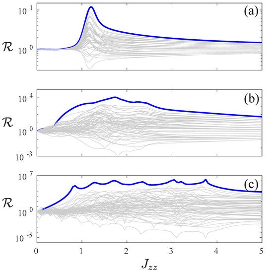 In Figure 4, rectification is plotted as a function of interaction . Similar to Figure 3, each line corresponds to a pair of magnetic field configurations, which are the reflection symmetric of each other. Highlighted in blue thick line is the , configuration pair which yields the strongest rectification. Here, we highlight the role of interaction in causing large rectification. In panel (a) of Figure 4, where , we observe the sharp transition to a steep increase in rectification occuring near , where the quantum phase transition occurs. This transition occurs at smaller values of for increasing h, as we observe for in panel (b) and in panel (c). With increasing h, the system behaviour deviates further from that of the XXZ spin chain system, and it is thus natural that the values of , for which an enhancement of rectification occur, deviates further from . Figure 4 thus highlights the importance of the interplay of kinetic, interactive, and dissipative terms in the master Equation (2) of the set-up.