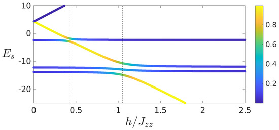 In Figure 1, Figure 2, Figure 3 and Figure 4, we have observed resonances, which correspond to peaks of currents and the largest rectifications. We now aim to gain an insight into this. The mechanism for the emergence of such resonances, and of the strong rectifications, can be understood by studying the configuration , where the field is in the positive direction in first half of the chain and negative in the other half of the chain (the configuration corresponding to the largest rectification). To give a clear idea of the mechanism, we focus on the case of . In Figure 5, we show the energy spectrum as a function of h for . For each magnitude h, the value of the energy is indicated by a point in the plot. Different colors of each point corresponds to the values of the overlap of the corresponding eigenvector with the state , i.e., . The vertical dashed lines show the position of the peaks of current for system size , as taken from Figure 2. It is clear from the figure that the avoided crossings in the spectrum matches with the maxima of the current. At these points, given the proximity in energy between different energy eigenstates, it is easier for the steady state to be in a mixture of different eigenstates, thus resulting in the possibility of larger currents (note that each energy eigenstate carries 0 current). The presence of avoided crossings for the peaks in Figure 1, Figure 2 and Figure 3 has been checked for all system sizes and parameters tested.