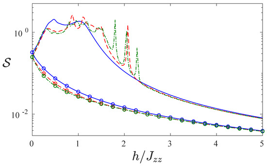 In Figure 6, we plot as a function of the ratio of local field strength and interaction for the state (red plots) and for the state (blue plots). For the state , quickly becomes small and it continues to decrease as h increases. This means that the state that is favored by the dissipator in reverse bias, , is almost entirely an eigenstate of the Hamiltonian. Hence, the steady state would be well approximated by this current-carrying state. We note that the blue solid, dashed, and dot-dashed curves relative to this state, each for a different system size, are almost completely identical.