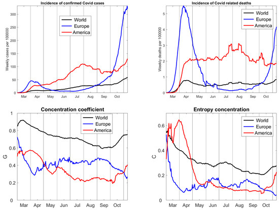 Time series of concentration coefficients were calculated for cases only. For deaths, they look similar, but more distorted due to the irregularities in the data. Gini’s G and our C show a similar time course. The pandemic becomes increasingly spread over the world, but the concentration increased since October because of the second wave in Europe. In Europe, raise of concentration from April to June indicated desrease of cases in various countries, while the second wave now hits all of Europe, causing uniform distribution of infections. In America, the situation has been constant for several months, but since October the concentration rises, probably due to an improvement in Brazil and Peru and increase of cases in Argentina and the US.