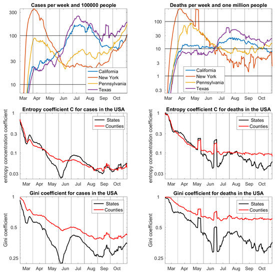 Figure 3, we have chosen four states that represent the time development. New York suffered a lot in the beginning of the pandemic and has now shown the smallest numbers of cases for some months. Pennsylvania had a similar development, less dramatic in the beginning, and with more recent infections. In California and Texas, the peak of the pandemic came in summer. Curiously, all four, and a number iof other states, had approximately the same number of cases in the beginning of June, and the same number of deaths in the end of June. This is reflected by the concentration coefficients.