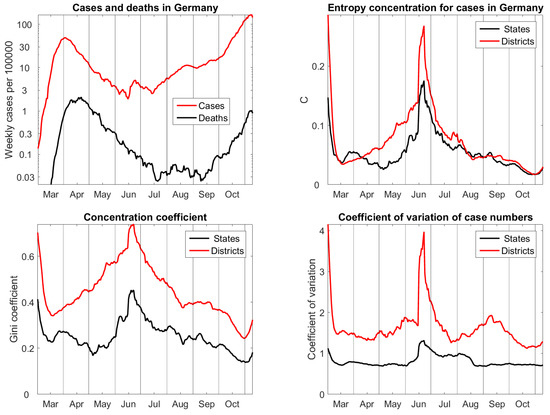 The entropy concentration coefficients for states and districts do almost coincide since July, and they show a continuous approach to uniform distribution, with exception of the very last week. However, in spring, the concentration of districts was higher than concentration of states. This is true, because many districts with small population density recovered very fast from the first wave, so that for several weeks there were between 100 and 200 districts each day without cases. On state level, the differences were smaller. The outbreak in the meat factory appeared in the federal state with the largest population, but in a district of average size that explains why the peak is so much bigger for districts than for states.