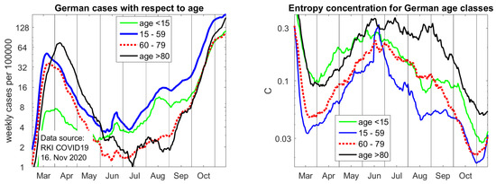 C also appear in the initial stage of an epidemic, and for big local outbreaks. In Germany, age groups—in particular, the vulnerable group of elderly above 80—develop differently with respect to concentration. A referee suggested that cross-correlation between countries and age classes could be further studied by forecasting and backcasting analysis, while using detrended cross-correlation coefficients, as in [