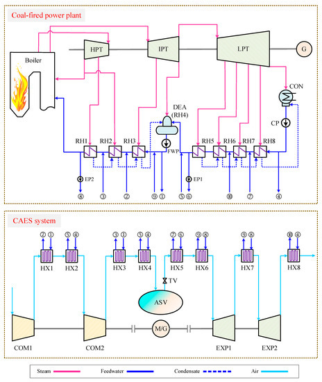 Diagram of the proposed compressed air energy storage (CAES) system incorporated with a coal-fired power plant.