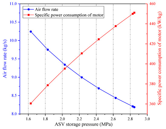 Figure 8 presents how the ASV storage pressure affects the primary energy flows in the CAES system. The charging process and discharging process of the CAES system are both impacted by the ASV storage pressure. The volume of the ASV is considered unchanged under various storage pressures, thereby the increment of the storage pressure leads to the growths of the compression ratios of the COMs, and the total mass amount of the stored air rises. Consequently, the heat amounts obtained from and transferred to the air increase with the augment of the ASV storage pressure. As the power consumption of the CAES system’s motor and the power generation of the CAES system’s generator are regarded as fixed, the charging time and the discharge time of the CAES system are extended. Hence, both the power input and power output of the CAES system are raised. What’s more, the inlet pressure of the EXP1 is throttled to keep a constant value, thus, the trend of the power input of the CAES system is steeper than that of the power output of the CAES system. Further, the coal power consumed by the CAES system changes little under different storage pressures. As a consequence, the round-trip efficiency of the CAES system dwindles with the increment of the storage pressure, as displayed in Figure 9. Since more air can be stored in the ASV when the storage pressure is larger, the energy storage density will be improved.