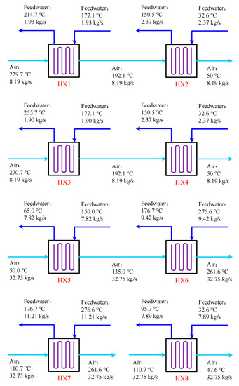 The feedwater of the coal power plant is exploited to recover/supply heat energy from/to the compressed air in the HXs, and the parameters of the HXs are illustrated in Figure 3. As the HXs are employed to accomplish the heat exchange between air and water, they are designed to be tube-type heat exchangers. Spiral finned tubes are suggested to be used as the heating surface. The corrosion of air is not severe, thereby normal carbon steel can be applied as the material of the HXs. During the charging process, the air out of the COM1 passes though the HX1 and HX2, and conveys heat to the feedwater taken from the FWP outflow and the CP outflow. Subsequently, the feedwater is sent back to the RH2 inlet and the deaerator (DEA) inlet. HX3 and HX4 utilize the feedwater from the FWP outflow and the CP outflow for air cooling as well, but the heated feedwater is delivered to the RH1 inlet and the DEA inlet. After finishing the above process, 3.34 MW heat is recovered from the hot compressed air, and the high-pressure air of 50.0 °C is eventually fed into the ASV. While the compressed air is released from the ASV, the air is heated by feedwater fetched from the RH5 outflow and RH1 outflow previous to the EXP1. The air that has expanded in the EXP1 is reheated by the feedwater extracted from the RH5 outflow, and then enters into the EXP2. Besides, the air discharged from the EXP2 is cooled by the feedwater from the CP outflow and its waste heat can be recouped. During the discharging process, the heat of 12.12 MW is transferred from the feedwater to the air for promoting the air temperature, and the waste heat of 2.08 MW is recovered from the exhaust air.