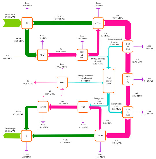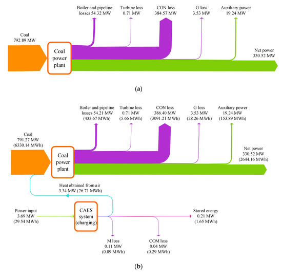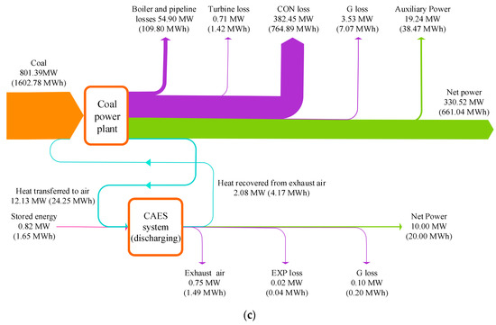 The detailed energy transfers and conversions that occurred in studied systems were examined and depicted in Figure 4. The fuel energy and the surplus electricity from the grid are recognized as the energy inputs of the hybrid system, and the net power of the coal power plant (330.52 MW) stays identical after the integration. The energy losses of the main components in the coal power section have no obvious changes. During the charging process of the CAES system, the feedwater heating system of the coal power plant absorbs 3.34 MW energy from the air, thereby the fuel energy input can be cut down by 1.62 MW. In the discharging period, the coal power plant conveys 12.13 MW heat energy to the CAES section, and the heat of 2.08 MW is recovered from the EXP2 outlet to the coal power plant. Regarding the entire energy storage process, 6.63 MWh energy is delivered from the CAES section to the coal power section, and the fuel energy input is increased by 4.02 MWh (as compared to the reference coal power in 10 h). Furthermore, the proposed CAES system can store 29.54 MWh electricity in off-peak hours and contribute to 20.00 MWh electricity when the power demand is strong.