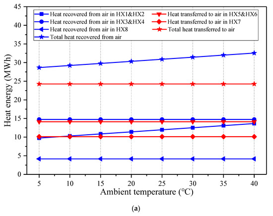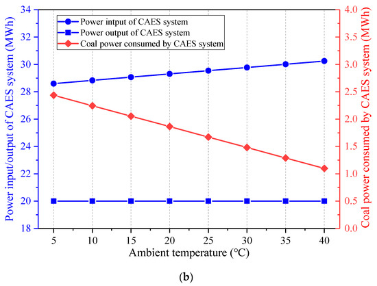 Influence of the ambient temperature on the main energy streams of the proposed CAES system, (a) heat energy recovered from and transferred to the air, (b) power streams and coal power consumed by the CAES system.