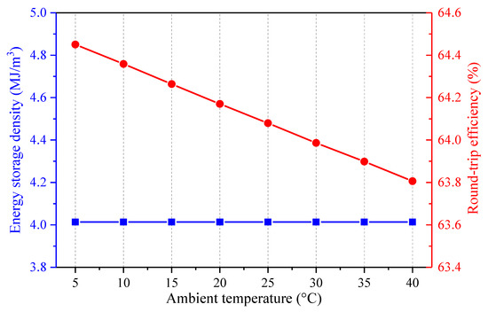 The impact of the ambient temperature on the energy flows of the proposed CAES system is illustrated in Figure 6. The variation of the ambient temperature mainly affects the air compression process, whereas, the air expansion process nearly remains constant. While the ambient air temperature grows, the heat recovered from the air in the HX1-2 and the total heat recovered from the air augment, but the other energy streams are inviable. The increment of the heat recovered from the air leads to the reduction of the coal power consumed by the CAES system. Furthermore, the power input of the CAES system increases, but the power production of the CAES system almost stays unchanged. As the power input of the CAES system is more sensitive than the coal power consumed by the CAES system with the change of the ambient temperatures, the round-trip efficiency of the CAES system declines with the decrement of the ambient air temperature, as shown in Figure 7. Since the volume of the ASV is maintained fixed, the energy storage density of the CAES system is unaltered. In general, a lower ambient temperature is more beneficial to the operation of the hybrid CAES system.