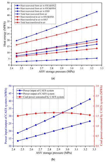 Influence of the ASV storage pressure on the main energy streams of the proposed CAES system, (a) heat energy recovered from and transferred to the air, (b) power streams and coal power consumed by the CAES system.
