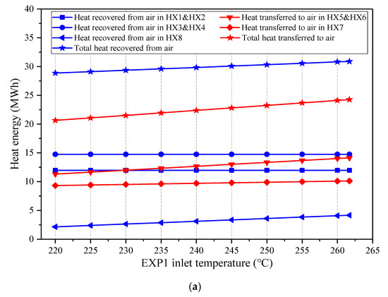 The influence of the EXP1 inlet temperature on the main energy streams of the CAES system is illustrated in Figure 10. The inlet air temperature of the EXP2 is maintained identical to that of the EXP1. The variation of the EXP1 inlet temperature only affects the discharging process of the CAES system, therefore the total mass amount of the stored air and the heat amounts recovered in the HX1-4 remain invariable. Once the EXP1 inlet temperature increases, more heat energy from the feedwater is required to heat the air into the EXPs and the heat exchange capacities of the HX5-8 augment. Hence, the coal power consumed by the CAES system rises. With the increasing EXP1 inlet temperature, the specific power generation capacity of the discharging air increases, resulting in the decrement of the air flow rate in the EXPs and a longer discharging duration. Hence, the energy storage density of the CAES system can be enhanced with a higher EXP1 inlet temperature, as indicated in Figure 11. Meanwhile, the round-trip efficiency of the CAES will be promoted.