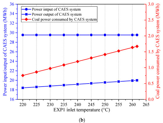 Influence of the EXP1 inlet temperature on the main energy streams of the proposed CAES system, (a) heat energy recovered from and transferred to the air, (b) power streams and coal power consumed by the CAES system.