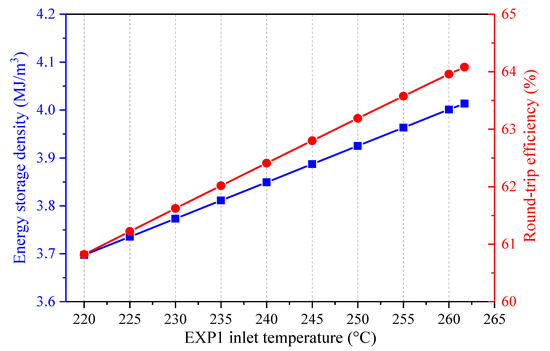Influence of the expander 1 (EXP1) inlet temperature on the performance of the proposed CAES system.