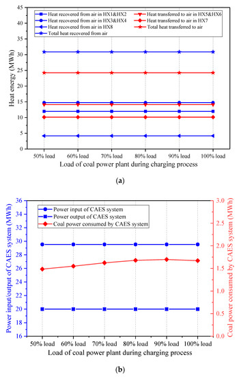 Influence of the coal power plant load during the charging process on the main energy streams of the proposed CAES system, (a) heat energy recovered from and transferred to the air, (b) power streams and coal power consumed by the CAES system.