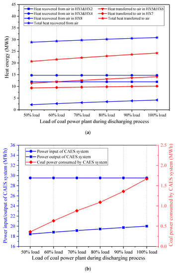 Influence of the coal power plant load during the discharging process on the main energy streams of the CAES system, (a) heat energy recovered from and transferred to the air, (b) power streams and coal power consumed by the CAES system.