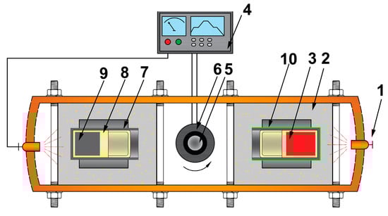 Schematic of the experimental apparatus: (1) microwave generator; (2) thermal insulator; (3) Al0.9CoCrFeNi alloy sample; (4) temperature-controlling system; (5) centrifugal axis; (6) conductive slip ring; (7) graphite crucible; (8) alumina crucible; (9) counterbalance sample; (10) microwave absorbing material.