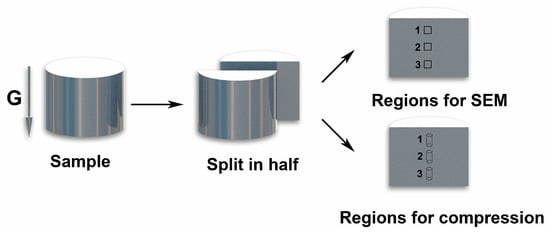 Sample preparation for scanning electron microscopy (SEM) and compression tests, as well as the corresponding points of the measurements.