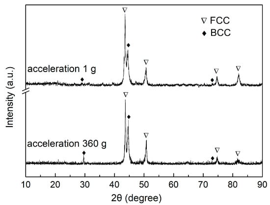 The XRD patterns of the samples prepared at acceleration 1 g and acceleration 360 g are compared in Figure 3. The strongest features were peaks corresponding to the BCC and FCC structure, thus, both phases formed under both normal and enhanced gravity conditions. Furthermore, the three strong peaks of the BCC structure become stronger when acceleration 360 g, because the content of BCC structure phases increase during the enhanced gravity-affected solidification process. The BCC structure phases include disordered B1 phase and ordered B2 phase. It is revealed by other reports that the lattice constants of the B1 and B2 phases in the AlCoCrFeNi alloy are close, so the corresponding diffraction peaks are difficult to distinguish [20].