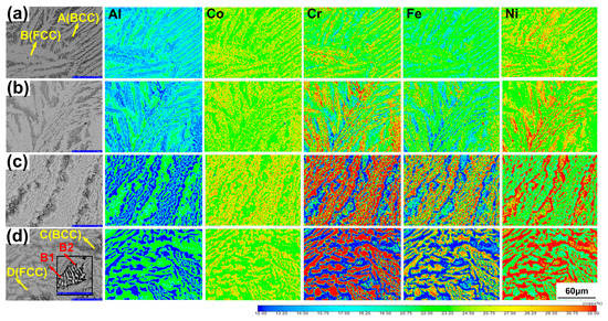 Figure 4 shows backscattered electron (BSE) images and the corresponding EPMA elemental mapping performed on samples obtained under different acceleration values. Table 2 lists the average contents of the BCC and FCC structure phases and the accurate contents of B1 and B2 phases in the samples obtained at acceleration 1 g and acceleration 360 g, which is marked in Figure 4d. Columnar nondendritic structures were observed in all samples (see Figure 4a–d). The grey regions, marked as “B” and “D” in Figure 4a,d are the side plates with an FCC structure. FCC structure phases consist primarily of Fe and Cr, while the amount of Al and Ni is smaller there. The black regions, marked as “A” and “C” in Figure 4a,d, contain a mixture of B1 and B2 phases. B2 phase is rich in Al and Ni (containing more lighter elements with black), and B1 phase consists mainly of Cr (and next Fe) and with small concentrations of Al and Ni (containing more heavier elements with white), as has been enlarged in the inset in Figure 4d. It can be seen from Figure 4 that, when acceleration was 210 g and acceleration was 360 g, the total amount of B1 and B2 phases increase, as this is compared to an acceleration of 1 g. The side plates of the FCC structure phase obtained under enhanced gravity fields were finer in samples obtained at acceleration 1 g. The thinnest side plate structure was obtained at acceleration 360 g.