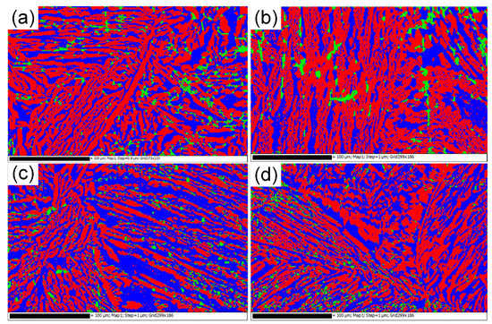 Electron backscattered diffraction (EBSD) data for the Al0.9CoCrFeNi alloy samples obtained under (a) acceleration 1 g; (b) acceleration 140 g; (c) acceleration 210 g; (d) acceleration 360 g. The red-, blue-, and green-colored areas correspond to the FCC, BCC, and unrecognized structure phases, respectively.