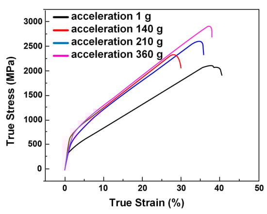 Compressive stress–strain curves of the Al0.9CoCrFeNi alloy samples prepared at different acceleration values: acceleration 1 g, acceleration 140 g, acceleration 210 g, and acceleration 360 g.