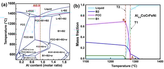 Equilibrium phase diagrams calculated using the PanHEA database: (a) phase compositions at different temperatures as a function of Al content in the alloy; (b) phase compositions at different temperatures for Al0.9CoCrFeNi. The red dashed line in (a) shows the (b) cross-section in relation to the phases of the AlxCoCrFeNi alloy with x = 0–2.0.