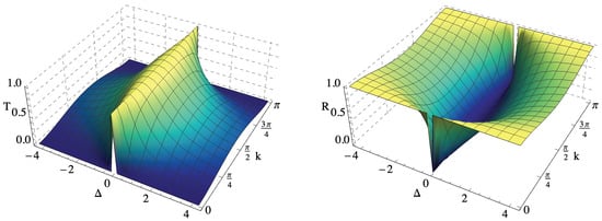 These coefficients closely resemble those corresponding to a delta potential in a continuous system [31]; in particular, the coefficients only depend on Δ 2 , meaning that there is no difference between an attractive or repulsive potential as concerns scattering. If Δ is fixed, T is maximum for k = π 2 , which corresponds to the highest group velocity (but not to the highest energy). Consistently, at the same value of k, R has a minimum. As the absolute value of Δ is increased, the transmission coefficient drops to smaller values, as reported in Figure 1. For every incident |k〉, we may thus define: