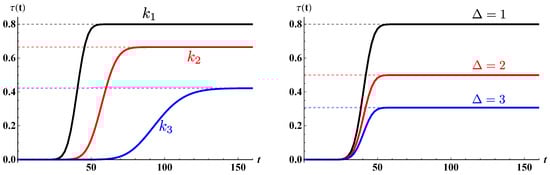 Figure 2. Transmission probability τ ( t ) . The left plot is for a fixed value of Δ = 1 and for decreasing values of k 0 = k 1 , k 2 , k 3 , with k 1 = π / 2 (black), k 2 = π / 4 (red), k 3 = π / 7 (blue). In the right plot, k 0 = π / 2 is kept fixed while varying the disorder Δ = 1 (black), Δ = 2 (red), Δ = 3 (blue). The dashed lines correspond to the value of the transmission coefficient τ G ( k 0 , Δ ) in Equation (25). In both plots, we considered σ = 15 .
