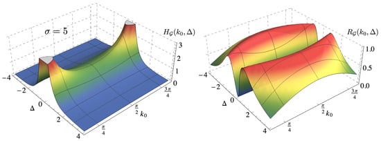 Figure 3. Left: QFI H G ( k 0 , Δ ) for an initial Gaussian wave packet with σ = 5 . Right: QSNR R G ( k 0 , Δ ) for the same initial Gaussian wave packet.