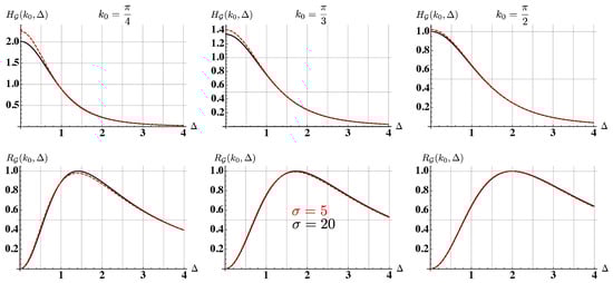 In order to compare the error of an estimator with the true value of the parameter to be estimated, we also address the QSNR, defined in Equation (11). Its behavior is shown in the right plot of Figure 3 and in the lower panel of Figure 4, for three different values of the initial central momentum k 0 . The QSNR has a maximum for Δ 0 , which corresponds to the value of the barrier height that can be better estimated. As the value of the initial central momentum is increased toward k 0 = π 2 , the value of the optimal Δ slightly increases. The dependency on σ is negligible when considering the QSNR, as shown in the lower plots, where the behaviors for σ = 5 and σ = 20 are compared. Quite remarkably, the maximum value of the QSNR is very similar, R G 1 for the considered values of k 0 , thus making the initial central momentum a tool to fine tune the optimal value of Δ , but not the corresponding precision.